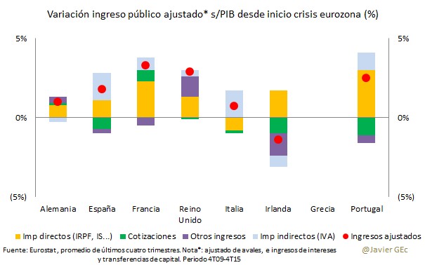 Por el lado de los ingresos, el incremento de la recaudación en España descansa sobre los impuestos- en especial indirectos como el IVA-, dado que la recaudación por cotizaciones ha descendido. El total de ingresos se ha incrementado más que aquellos países con superávit como son Alemania, Italia o Irlanda, pero menos que en los otros países con un déficit elevado -en el caso de Grecia el incremento de ingresos del 15% es muy superior al resto de países-.