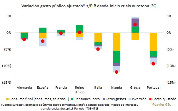 - Consumo público: ha sufrido un ajuste inferior al de la inversión. Esta partida incluye los salarios de los funcionarios o las compras de bienes y servicios por las Administraciones Pública y es la partida que más se podría asimilar con el concepto de "austeridad" real.