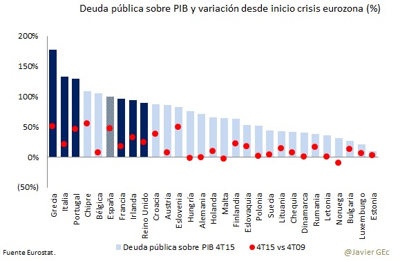 En resumen, España registra un déficit elevado, el segundo más alto de la UE tras Grecia. Como consecuencia, España también ha experimentado el mayor aumento de la deuda pública de Europa, tan sólo por detrás de Grecia, Chipre y Eslovenia.
