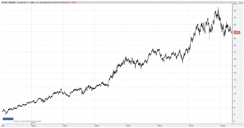 A pesar de que Inditex se acerca al concepto de empresa perfecta, sólo hay un problema: el precio al que cotizan sus acciones. En la actualidad, el valor cotiza con un precio de 27,67 euros por acción, representando una subida superior al 400% desde 2009.
