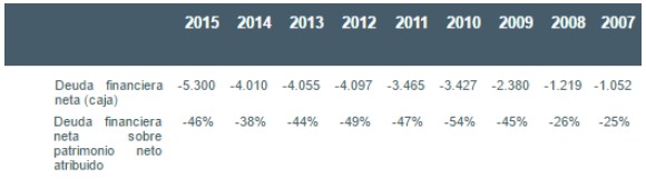 Por otro lado, si hay algo que fascina a los inversores es que una empresa tenga una gran capacidad para generar caja. Pues bien, Inditex sería una maquinaria perfectamente engrasada para generar montañas de efectivo. En su estructura financiera, la deuda financiera neta se ha mostrado durante los últimos años negativa. Es decir, en sucesivos ejercicios el efectivo y equivalentes se han mantenido superiores a la deuda financiera consolidada del grupo.