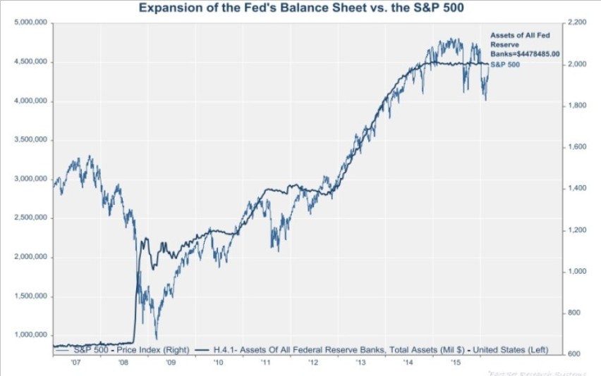 A pesar de que la FED tenía como finalidad alterar la curva de rendimientos de los bonos estadounidenses para que el Gobierno pudiera financiarse a menor coste, la consecuencia (deseada o no) también ha sido la espectacular subida del S&P500. De hecho, Brian Barnier, director en ValueBridge, afirma que el 93% del movimiento al alza en el S&P 500 ha sido causado por la Reserva Federal. Como podemos ver en el siguiente gráfico, la correlación es más que evidente entre la ampliación del balance y la evolución del selectivo estadounidense.