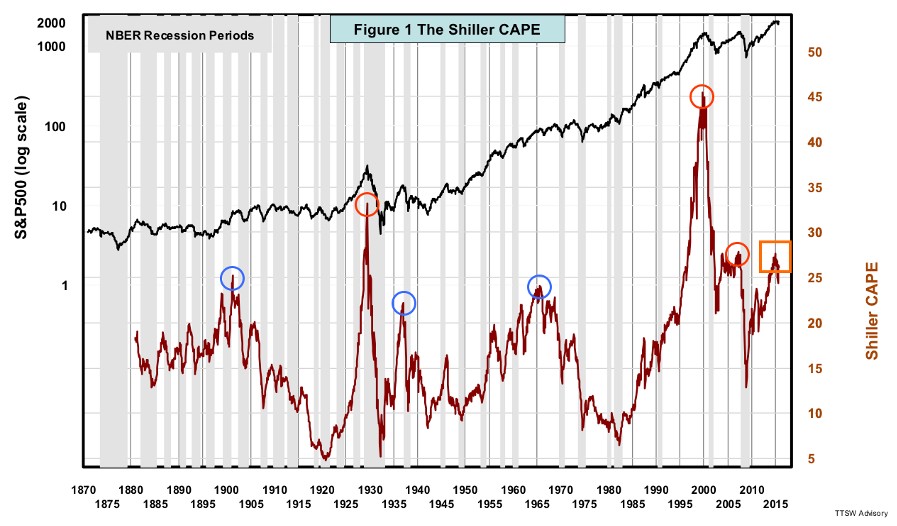 Lo más interesante es la extremada sobrevaloración del selectivo, y para ilustrarlo utilizaremos el PER de Shiller o CAPE, una ratio que compara el S&P Composite real (corregido por inflación) con el promedio de los beneficios de los últimos diez años ajustado a la inflación.