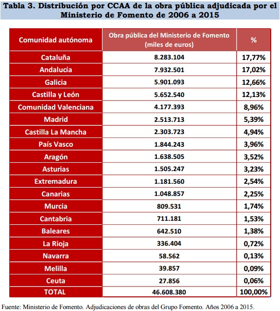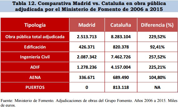 El informe, muy completo, analiza a dónde han ido a parar los 51.273 millones que Fomento y las empresas públicas asociadas (AENA, ADIF, Puertos del Estado…) han invertido de 2006 a 2015. De esta cifra, se pueden "territorializar" 46.608 millones. Pues bien, Cataluña ha recibido 8.283 millones, un 17,7% del total, la cantidad más elevada de las 17 autonomías. Sólo Andalucía, una región mucho más extensa y con 900.000 habitantes más, se sitúa cerca con un 17,2% del total. Mientras tanto, Madrid, tradicional centro de las iras del nacionalismo, sólo ha recibido 2.513 millones en estos diez años, apenas un 5,39% del total