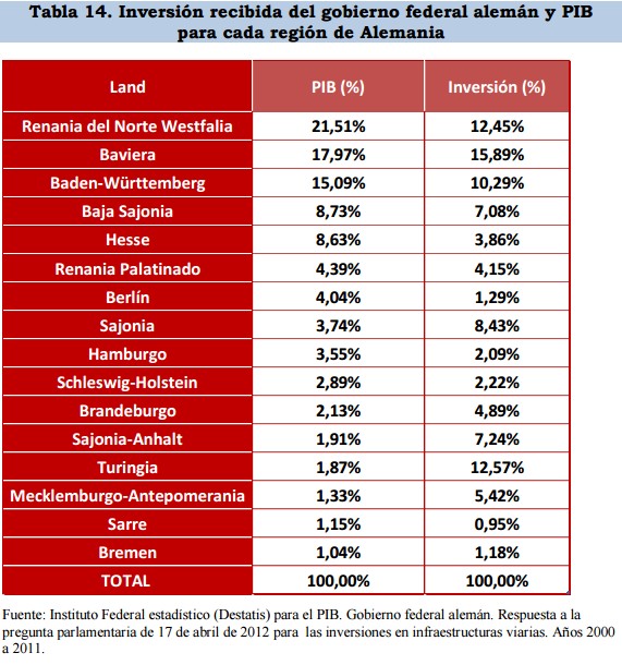 En ninguno de los cinco grandes länder que más aportan al PIB de Alemania el gobierno federal invierte en ellos un porcentaje equivalente a su contribución al PIB sino sustancialmente inferior.