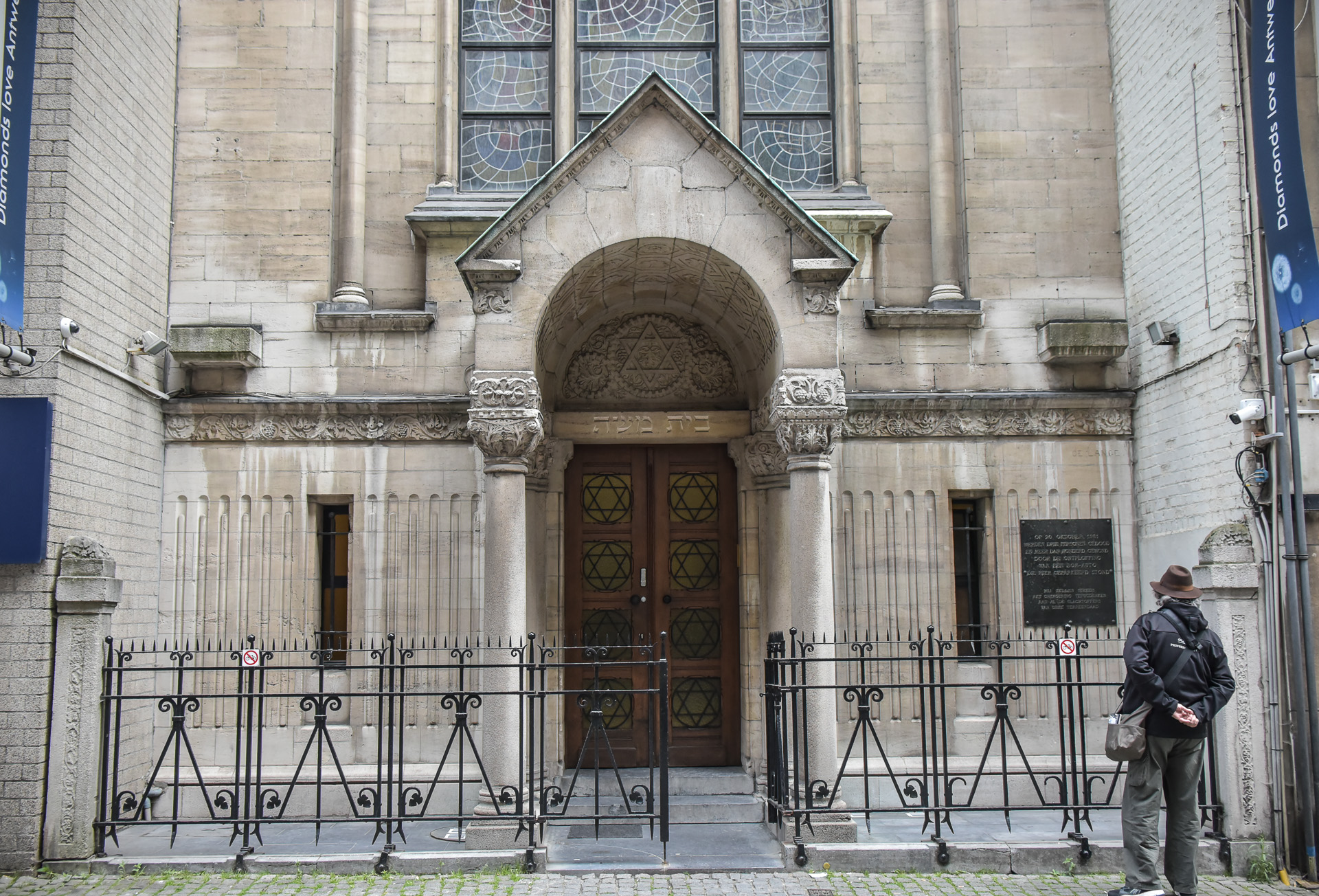 La puerta de la sinagoga del barrio de los diamantes. En su fachada, una placa recordando el atentado de 1981.
