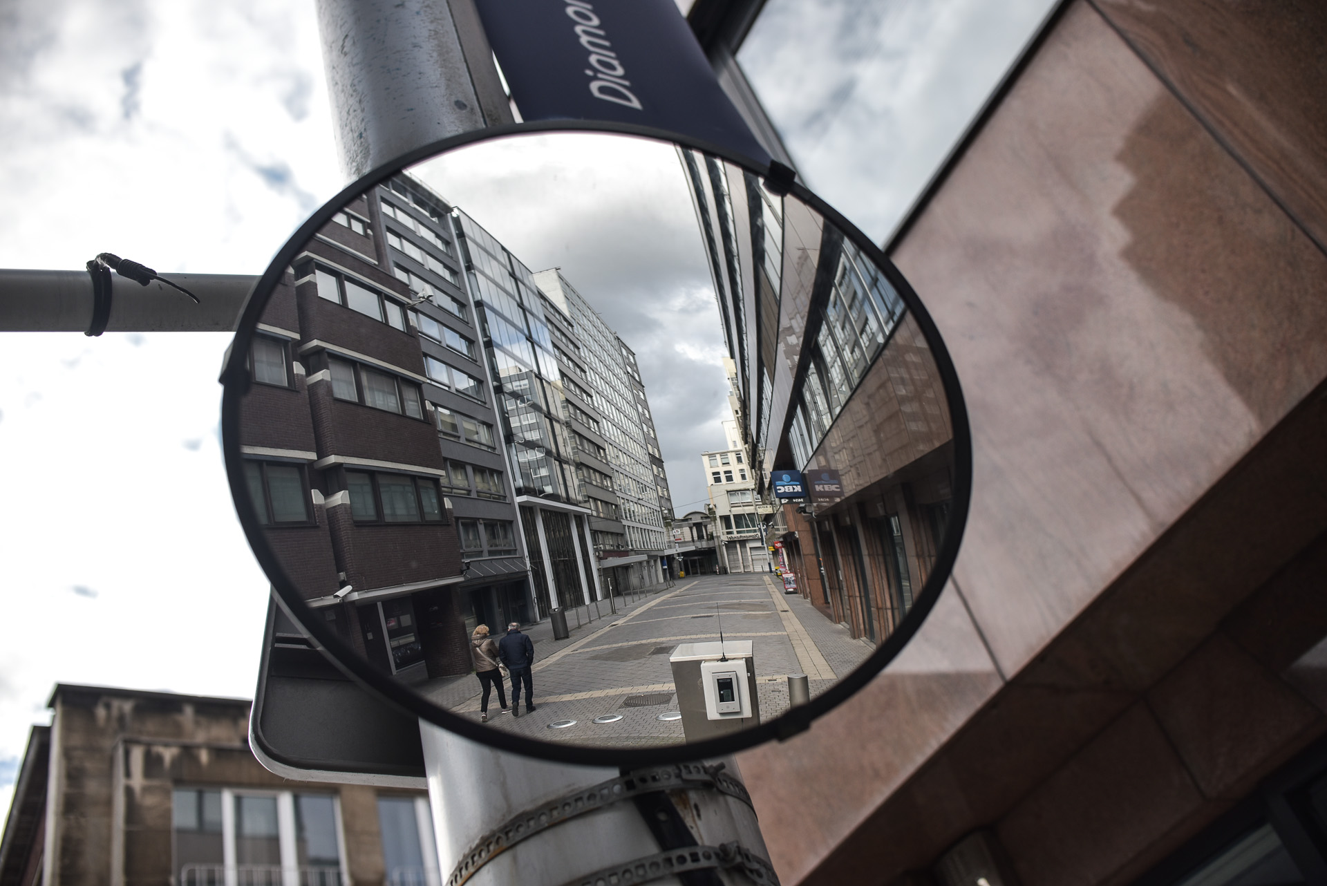 Un espejo retrovisor muestra una de las calles principales del barrio de diamantes de Amberes.