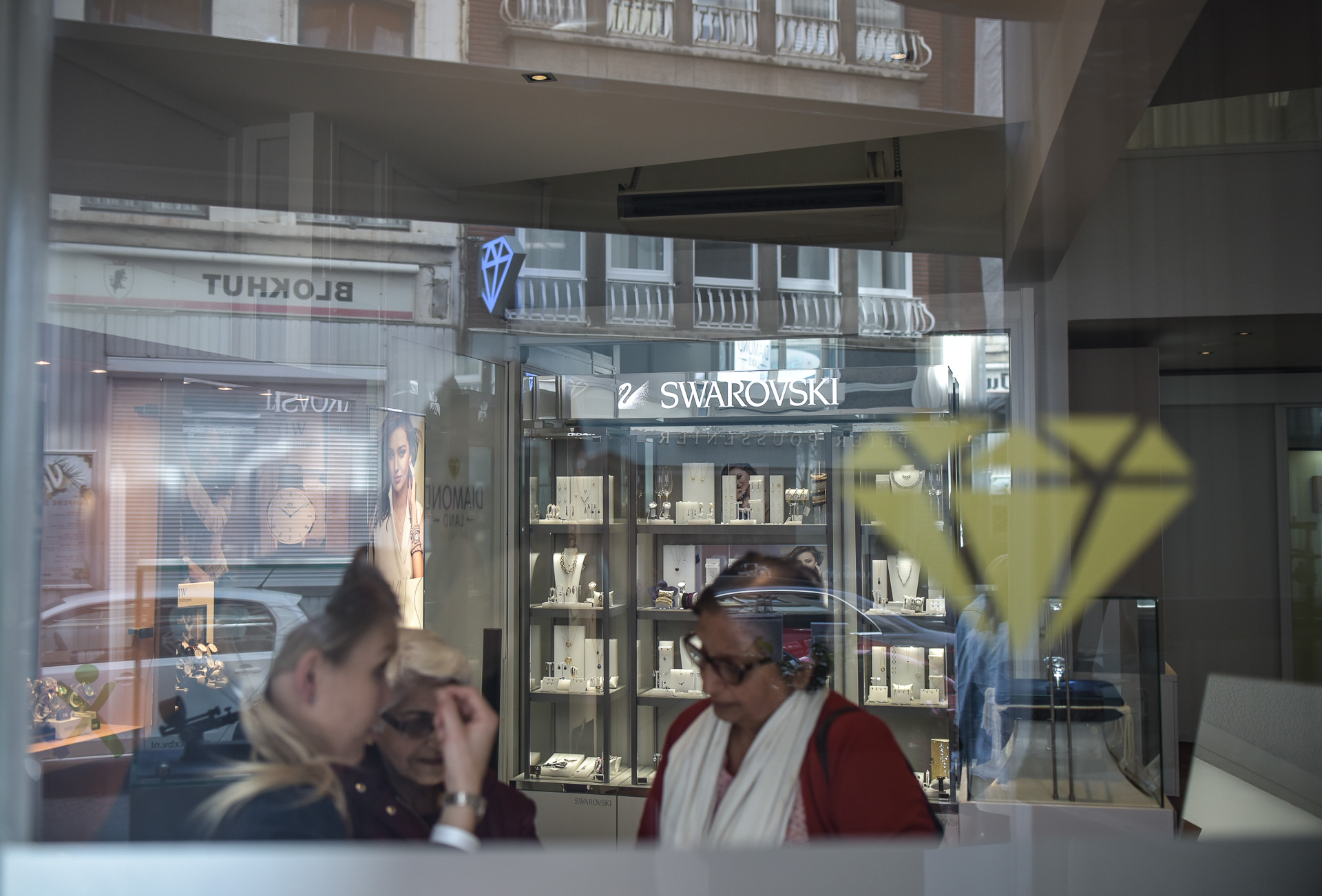 Una mujer pasea con su bicicleta por la calle Appelmans Straat, en la esquina el establecimiento Antwerp Diamonds, muy cerca del barrio del diamante en Amberes.