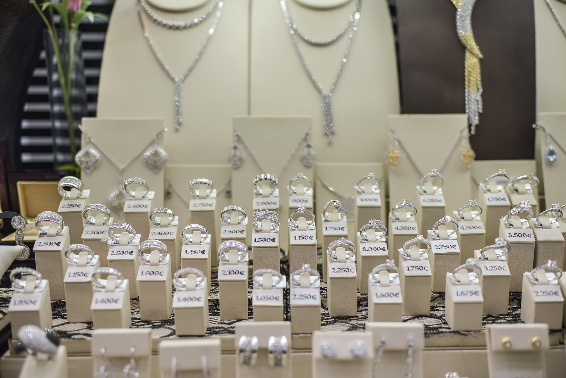Un escaparate muestra la variedad de precios de las diferentes piedra preciosas y diamantes.