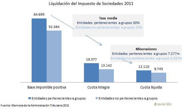 En primer lugar, ¿de verdad pagan tan poco las grandes empresas? En el siguiente gráfico resumo cómo se calcula el IS con datos acumulados de dos categorías de empresa: entidades pertenecientes o no a un grupo consolidado. En el primer caso, se encuadran las empresas de menor dimensión; en el segundo, al formar parte de un grupo de sociedades, se consideran empresas de mayor dimensión.