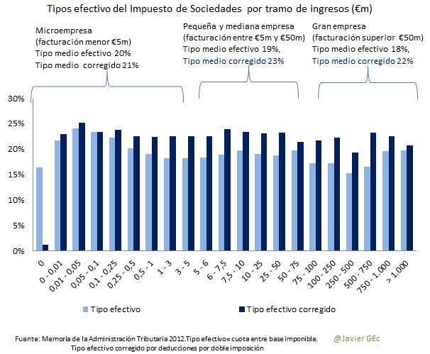 Como se puede observar en el anterior gráfico, las entidades de mayor dimensión tributaron en 2011 a un tipo superior del 30% frente al tipo reducido del 25% de las pequeñas. Y aunque disfruten de mayores minoraciones en la cuota, pagan lo mismo. En comparación con su base imponible, las grandes empresas pagan un tipo efectivo del 18,7% mientras que las de menor tamaño pagan un 18,6%.