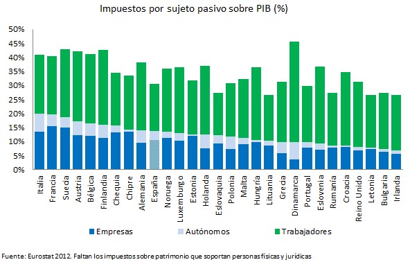 De hecho, si bien en España la recaudación medida sobre el PIB es relativamente baja (puesto 20 de 29 países), en términos de carga impositiva sobre las empresas y autónomos, su posición asciende al número 10 de la UE.