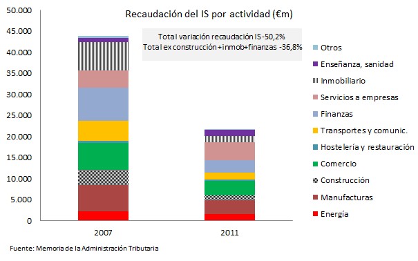 Por último, recordar que la evolución de la recaudación por IS está determinada por la actividad de las empresas. Así pues, debe ponerse en contexto el negativo impacto de la crisis en las empresas según al sector al que pertenezcan. Desde el estallido de la burbuja inmobiliaria hasta 2011, la recaudación por IS bajó a la mitad, pero si se excluyen las actividades vinculadas con el ladrillo (construcción, servicios inmobiliarios o banca), la pérdida se limita a poco más de una tercera parte.