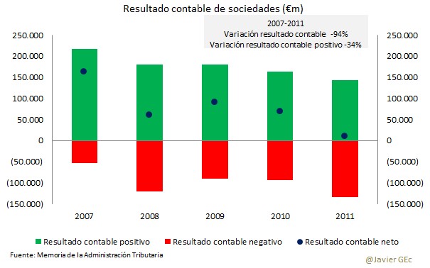 Durante los años de crisis, el resultado contable de las empresas se ha desplomado (un 94% menos), pero el de las sociedades con resultado positivo -mejor referencia de la recaudación positiva- ha descendido un 34%, bastante menos. Es la evolución de las sociedades en pérdidas la que explica esa diferencia.