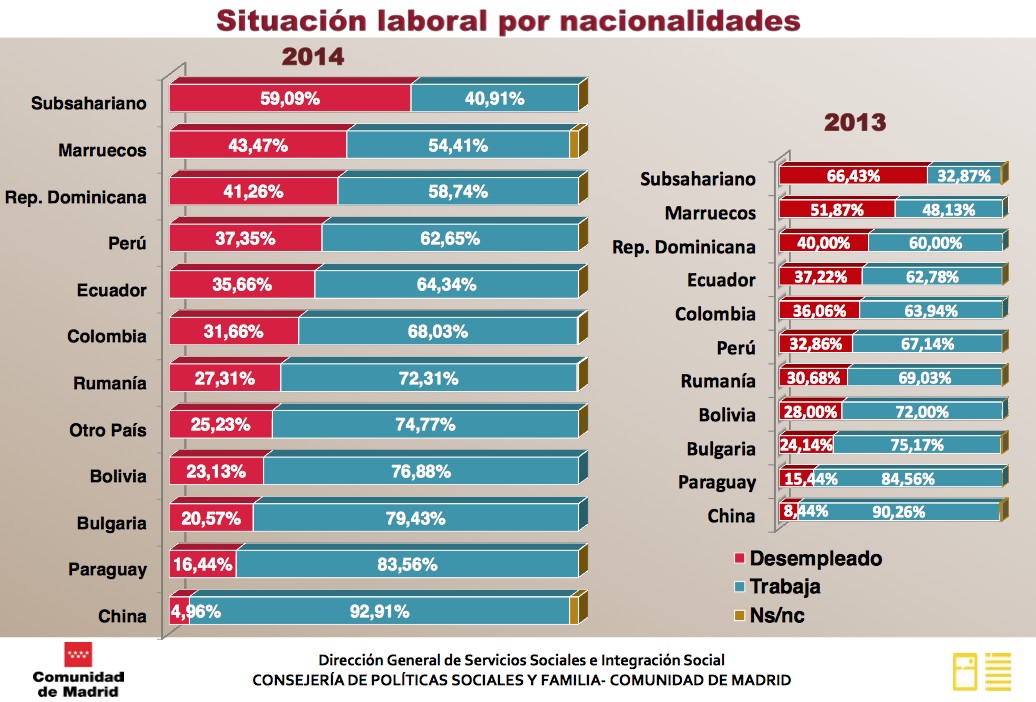 ¿Cuál es la situación del empleo de dichos colectivos? De acuerdo con la última Encuesta Regional de Inmigración, publicada en 2015 con datos de 2014, los mejores resultados son los que obtienen los chinos. Para dicho colectivo, el nivel de ocupados ronda el 93% y el paro no alcanza siquiera el 5%.