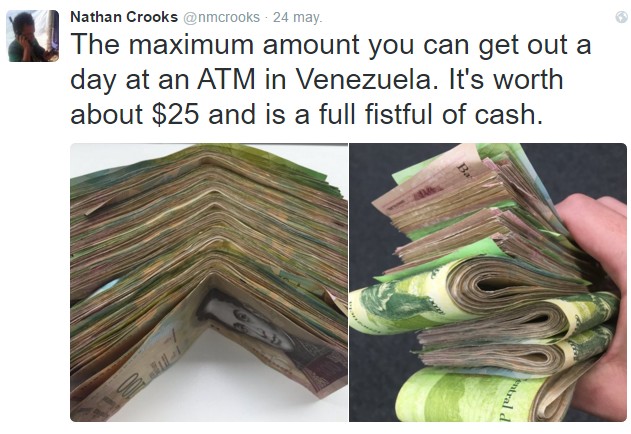 Esta semana era el Nathan Crooks, el corresponsal de Bloomberg en Caracas, el que sorprendía en Twitter con una foto. En la imagen, el periodista sostenía un gran fajo de bolívares y explicaba que se trata de "la cantidad máxima que se puede sacar un día en un cajero automático en Venezuela". Lo grave es que ese montón de billetes tiene un valor aproximado de 25 dólares.