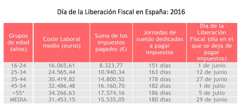 El informe de Civismo en 2016, elaborado por el economista Javier Santacruz, desglosa el Día de la Liberación Fiscal por distintos tramos de edad. Por ejemplo, un trabajador que tiene entre 16 y 24 años dedica 151 días a pagar impuestos, mientras que uno de más de 55 pierde el salario de 186 jornadas a cumplir con Hacienda. Dependiendo del tramo de edad, el Día de la Liberación Fiscal llega entre el 1 de junio y el 5 de julio, si bien la fecha del 29 de junio es la media para todos los grupos de edad.