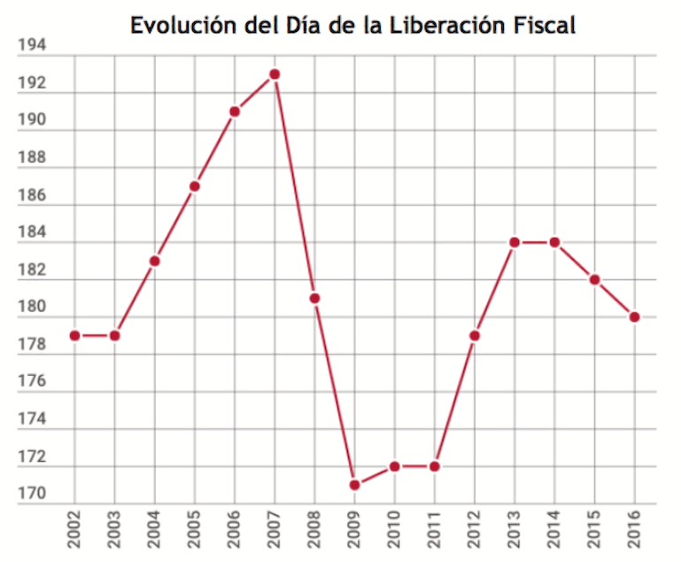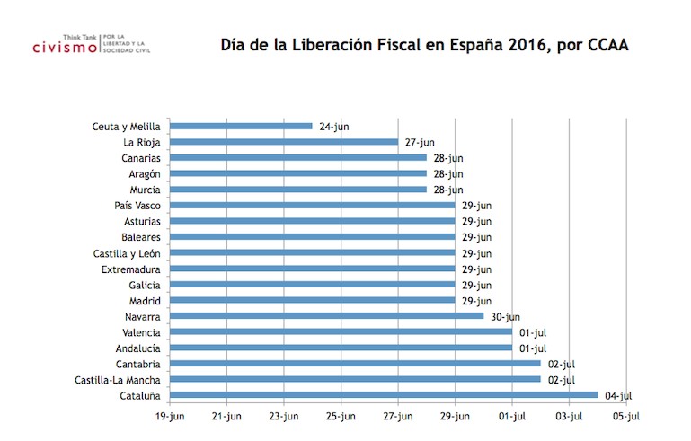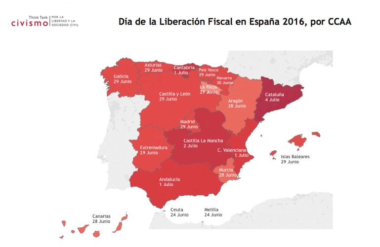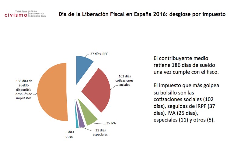 Desde hace más de un lustro, el think tank Civismo publica anualmente el Día de la Liberación Fiscal, un estudio que traduce el peso real de los impuestos en los días de sueldo necesarios para cumplir con Hacienda. De acuerdo con el informe para 2016, un contribuyente medio dedica 180 días de trabajo a pagar IRPF, cotizaciones, IVA, especiales y otros gravámenes, por lo que solamente empieza a ganar dinero para sí mismo a partir del 29 de junio.