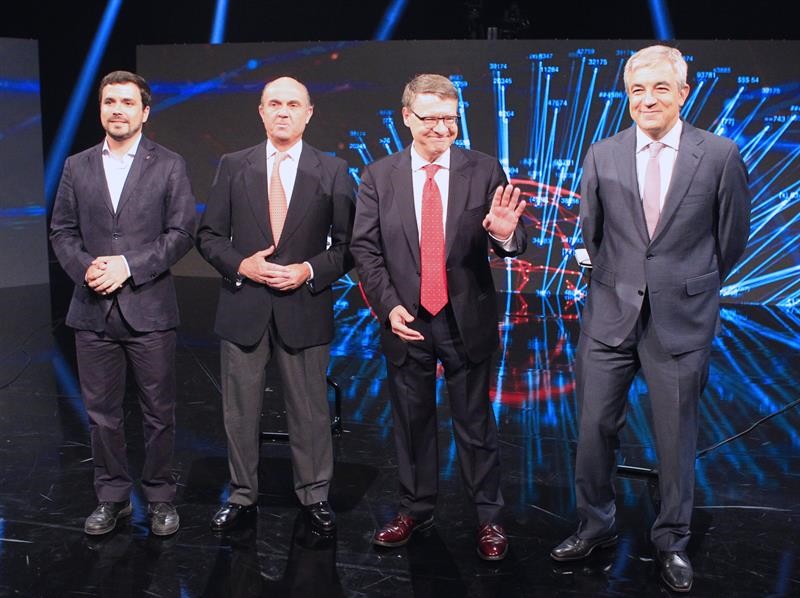 De Guindos le recordó a Sevilla que "no se puede quejar uno a la vez del déficit y de los recortes". El ministro del gobierno de Rajoy dijo que el PP "es el único partido que defiende bajar los impuestos". Garzón intervino después e insistió en afirmar que las grandes empresas pagan alrededor del 6% en el Impuesto de Sociedades.