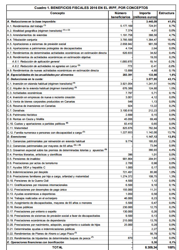 Pero no hay que engañarse, de los 8.300 millones que prevé Hacienda que se ahorrarán los contribuyentes por este concepto, 725 vienen por reducciones por rendimiento de trabajo, 1.364 por tributación conjunta, 1.241 por inversión en vivienda habitual, 742 millones por la deducción por maternidad o 1.142 por familia numerosa o con discapacitado. Sólo con estas cinco rúbricas ya tenemos bastante más de la mitad del total. Y no son precisamente beneficios a los que se acojan las rentas más altas, sino más bien al contrario.