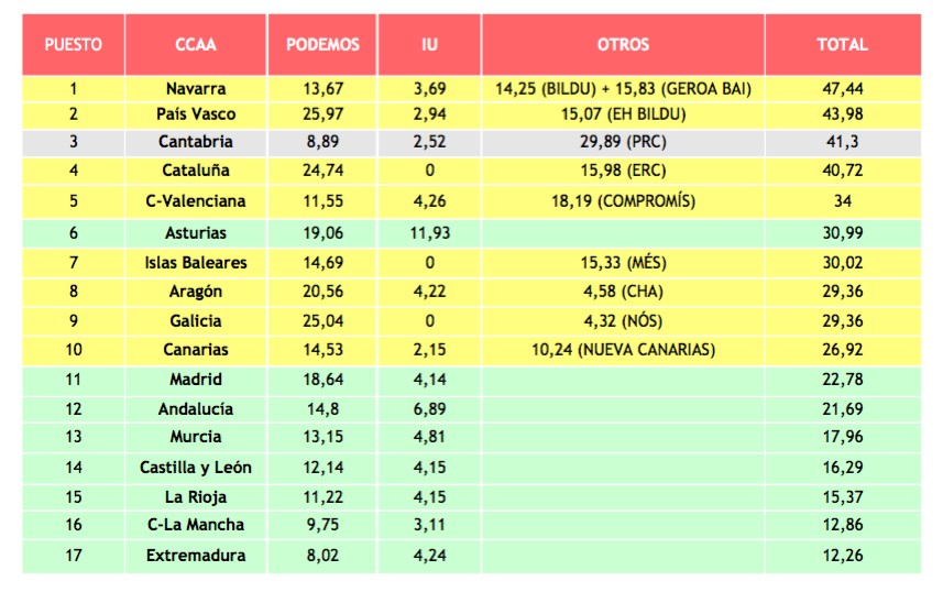 Por el contrario, en los puestos 3 a 10 proliferan los casos de autonomías en las que existe una pinza entre el populismo autoritario de Podemos e IU y el populismo separatista. Es el caso de Cataluña, la Comunidad Valenciana, las Islas Baleares, Aragón, Galicia y Canarias. Solamente hay un caso en el que no hay presencia de populismo autoritario: Asturias, una comunidad en la que tradicionalmente se ha registrado un nivel muy alto de apoyo a IU.
