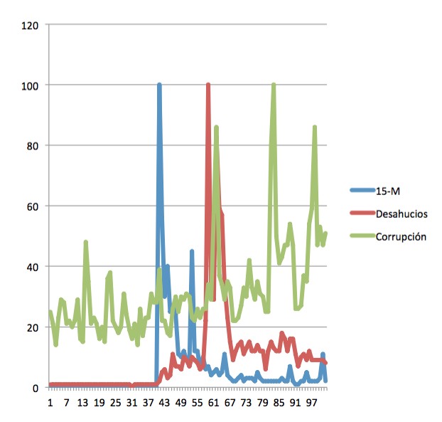 La siguiente gráfica muestra el interés por el 15-M, los desahucios, la corrupción… Los altibajos muestran que el populismo va enarbolando una u otra causa porque esto le permite marcar la agenda política y moderar su imagen a base de apoyar causas compartidas por millones de españoles.