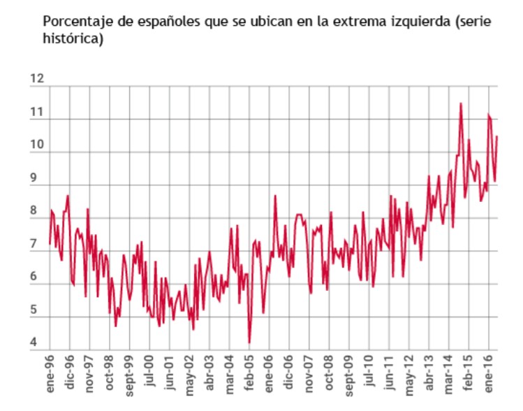 El porcentaje de españoles que se ubica en la extrema izquierda según los sondeos del CIS no ha parado de aumentar desde 2004. Al comienzo de la primera legislatura de José Luis Rodríguez Zapatero, el número de personas que se enmarcaba en este espectro radical se movía entre el 4% y el 6%. En la actualidad, la extrema izquierda aglutina a más del 10% de los españoles.