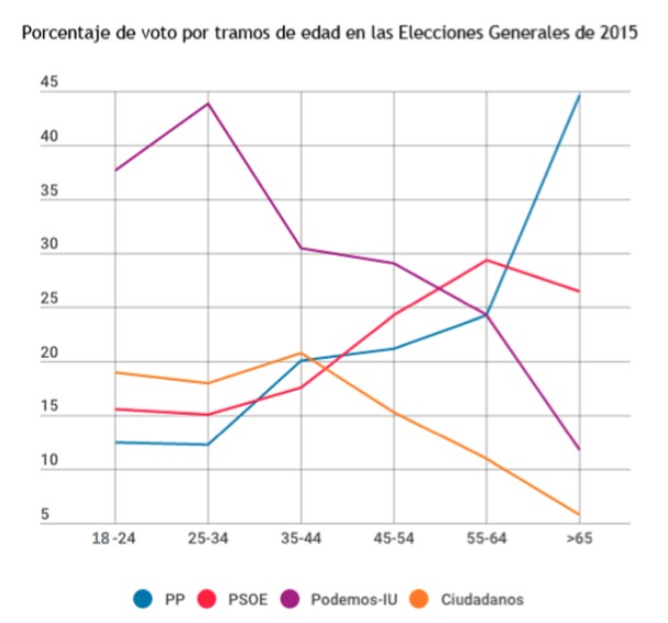 Por tramos de edad, el respaldo a Podemos e Izquierda Unida se ha disparado entre los más jóvenes. Para los votantes menores de 35 años, hablamos de niveles de apoyo de entre el 35% y el 45% frente a un techo del 20% para los demás partidos.