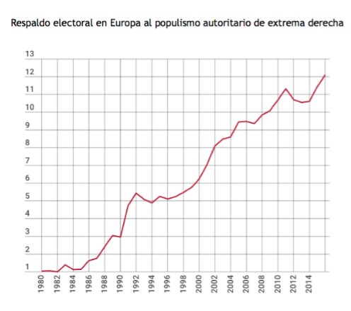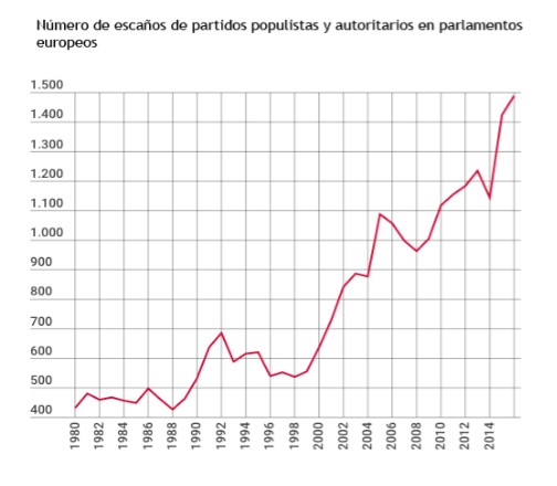 El acceso del populismo autoritario a los parlamentos nacionales europeos ha subido de forma espectacular desde el año 2000 hasta hoy. Si hace quince años había 600 representantes elegidos por estas formaciones, hoy esta cifra ronda los 1.500 escaños adscritos a partidos populistas y autoritarios.