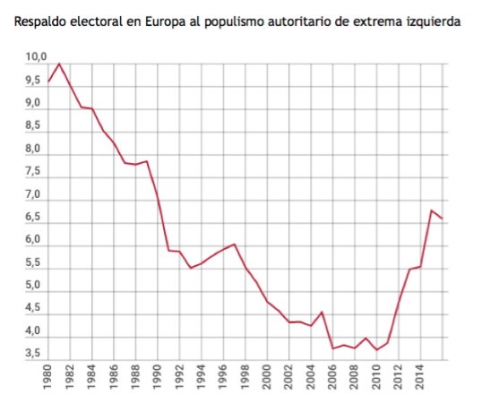 Por el flanco de la extrema izquierda de raíz populista (Podemos, Movimiento 5 Estrellas, Syriza…), la evolución entre 1980 y 2016 tiene forma de V. En la década de 1980, el descrédito del comunismo soviético contribuyó al desplome de la intención de voto a los viejos partidos marxistas. Sin embargo, la renovación de dichas formaciones y la irrupción de nuevos liderazgos encontró en la crisis económica el caldo de cultivo perfecto para volver a ocupar un espacio más relevante en el ruedo político.