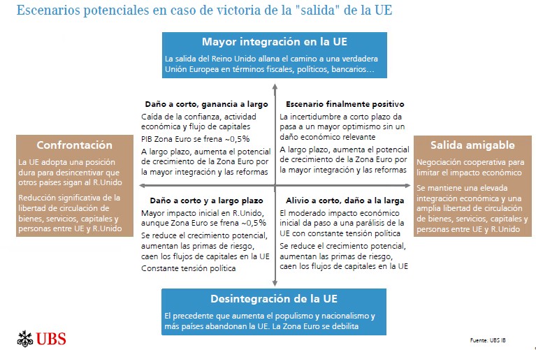 Los potenciales escenarios en caso de que ganase el Brexit se resumen en el siguiente cuadro elaborado por el banco suizo UBS.