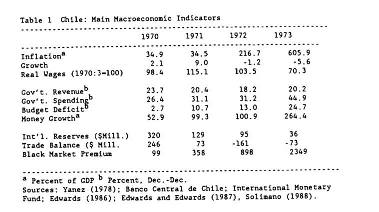 El monumental estudio de Rudiger Dornbusch y Sebastian Edwards sobre el "populismo macroeconómico" nos permite repasar con detalle el desastre económico que sufrió Chile en la década de 1970. Allende heredó una economía relativamente estancada, con tasas reales de crecimiento que apenas superaban el 1% en los cuatro años posteriores a su llegada al poder. Tras llegar al poder, el mandatario chileno lanzó un amplio programa de expropiaciones que condujo a la nacionalización de todo tipo de empresas, incluyendo negocios agrícolas, compañías mineras…