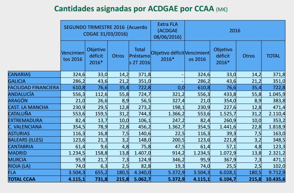 "España es España". Ésta es el mejor argumento que Cristóbal Montoro ha podido encontrar este jueves por la mañana para explicar por qué el Estado acudirá de nuevo al rescate de las CCAA, que en 2015 se saltaron de forma masiva sus objetivos de déficit y que, sin embargo, seguirán teniendo acceso a los mecanismos de financiación "extraordinarios" que el Gobierno aprobó hace cuatro años. No habrá nuevas exigencias. Ninguna región será penalizada. Y tampoco se pedirán requisitos extra. FLA para todos.