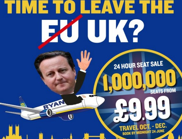 En un mensaje de Twitter, acompañado de un montaje de David Cameron subido a un avión, la compañía se pregunta: "¿Hora de abandonar el Reino Unido? Ahorra como Cameron, y planea tu escapada en otoño". La irlandesa anuncia esta atractiva oferta para el mes de octubre.