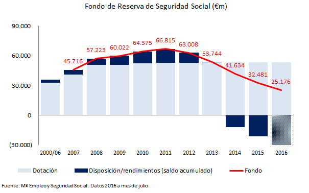 El pasado mes de junio, la Seguridad retiró del Fondo de Reserva, más conocido como hucha de las pensiones, cerca de 9.000 millones de euros para poder hacer frente a la paga extra de los pensionistas. Como se puede observar en el siguiente gráfico, la tendencia decreciente del Fondo es clara, desde casi 70.000 millones de euros en 2011 a poco más de 25.000 millones en 2016.