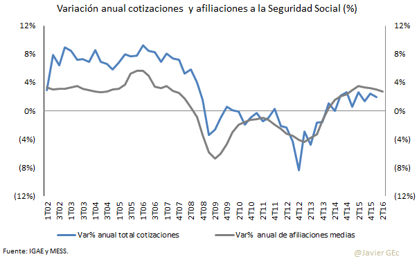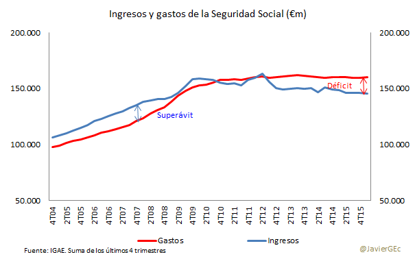 El problema es que la principal partida de ingresos en forma de cotizaciones crece en 2016 por debajo del de la principal partida del gasto que son las pensiones contributivas; éstas lo hacen un 3% que se explica a su vez por un incremento del 1,1% debido al mayor número de pensionistas y de un 1,9% porque los nuevos pensionistas se incorporan con pensiones más altas.