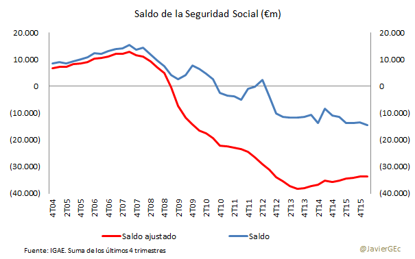 De todas formas ese déficit no refleja la verdadera realidad de la Seguridad, pues dicho saldo está distorsionado por las transferencias que desde el Estado se destinan a financiar parte de las prestaciones por desempleo. Si se ajusta el saldo por las transferencias se observa que sin transferencias el sistema es deficitario desde desde 2009 y sólo la recuperación económica ha permitido reducirlo mínimamente desde 2013 hasta unos 34.000 millones de euros en la actualidad.