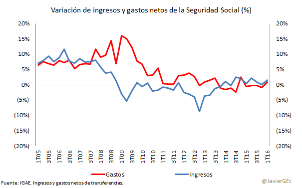 Excluyendo el efecto de esas transferencias, lo que nos permite observar mejor la evolución real de los ingresos y gastos del sistema, los ingresos crecen algo más que los gastos, aunque esa diferencia en 2016 es mínima.