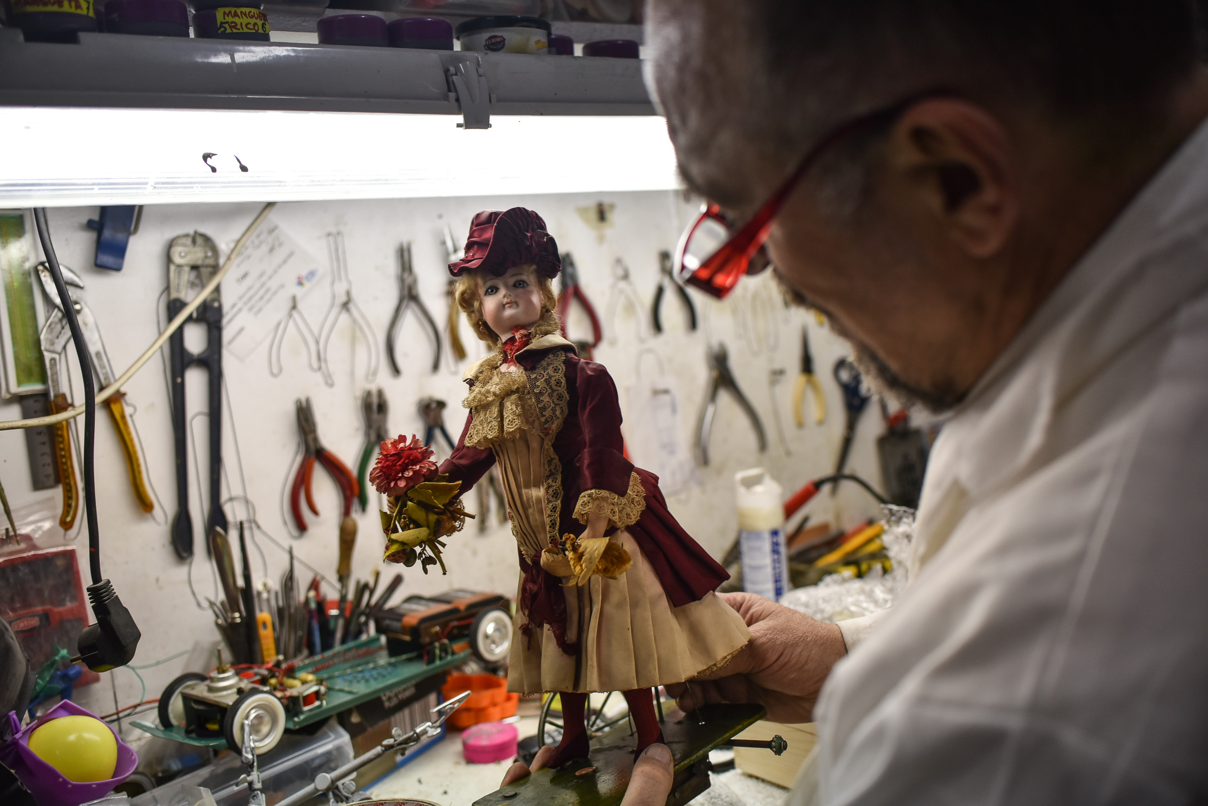 Antonio, trabajando con su muñeca más antigua y autómata. Le arregla la rueda con plomo.