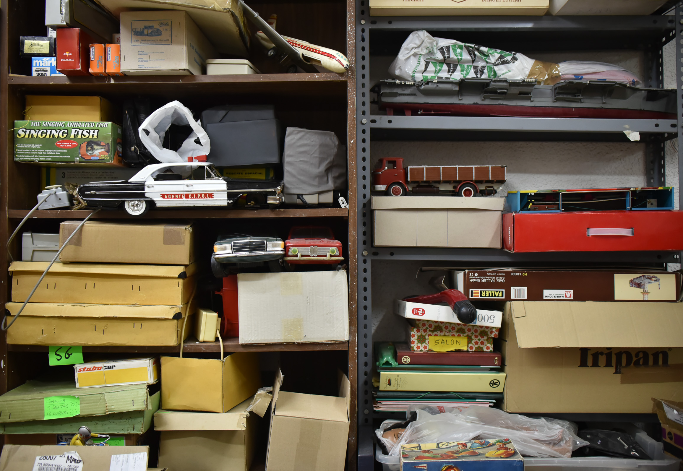 Las estanterías repletas de cajas escoden piezas de vehículos antiguos y otros juegos variados.