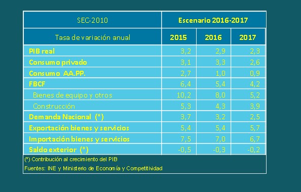 Para 2017, sin embargo, la estimación de crecimiento se reduce una décima, hasta el 2,3% debido a una "menor aportación de la demanda nacional, en concreto, de la inversión". El Gobierno considera su pronóstico "prudente y realista" y recuerda que a cierre de 2017, "la economía española encadenará cuatro años de crecimiento". El nuevo cuadro macro estima que el PIB real mantendrá una velocidad de crucero media del 2,6% entre este año.