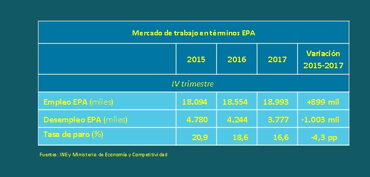 Como se observa en el cuadro, en términos de la Encuesta de Población Activa (EPA) se espera que el número de ocupados acabe 2017 en 18,993 millones, cifra que sería la más elevada desde el tercer trimestre de 2009. Entre los dos años se crearán 899.000 empleos y el número de parados se reducirá en 1,003 millones.