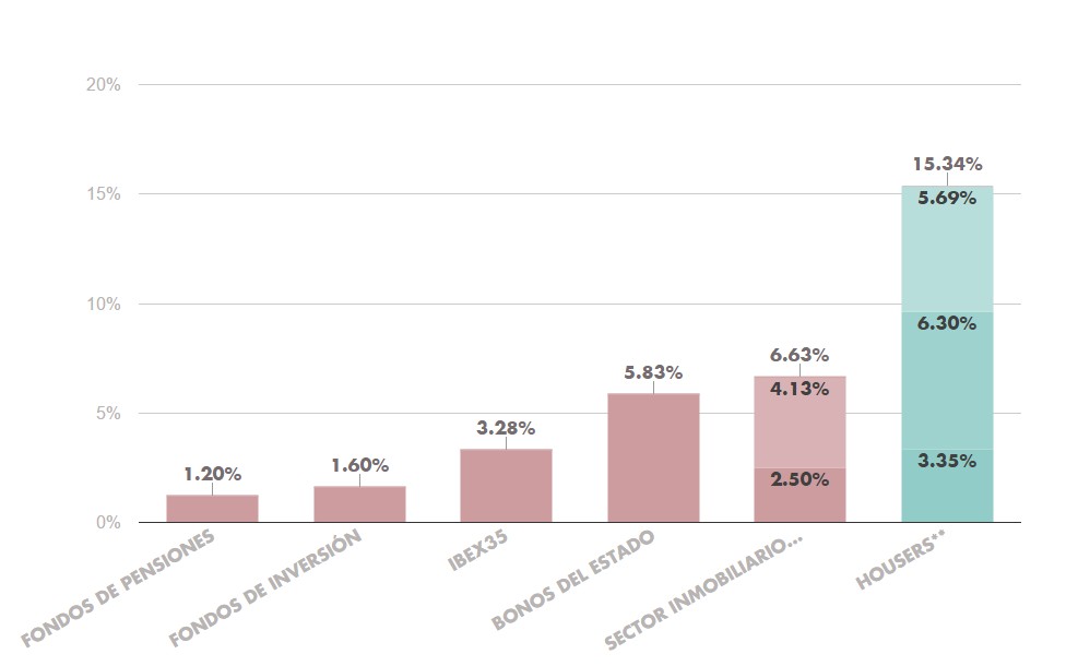 La rentabilidad de los inmuebles de Housers está compuesta por la rentabilidad media neta del alquiler de los pisos, que se estima del 3.35%, el incremento del precio de la vivienda durante 2016, que será del 6,30% y el descuento inicial medio de cada oportunidad hasta ahora entre el número de años (4 años) estimados de media antes de la venta, el 5,69%.
