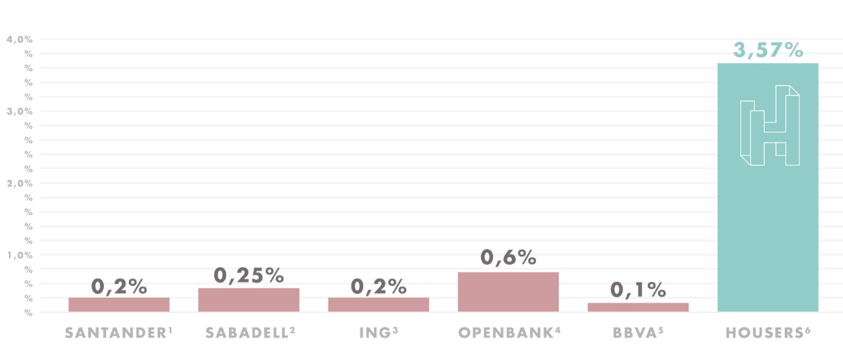 Una vez seleccionados, ofrece a sus usuarios la posibilidad de adquirirlos aportando la cuantía que deseen desde 50 euros junto a otros compradores. Tras realizar la compra, los nuevos dueños comienzan a recibir una rentabilidad mensual por su puesta en alquiler y su venta. Como se observa en el gráfico, los dividendos superan con creces los de los depósitos bancarios.