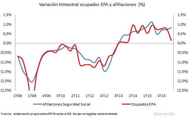 El crecimiento del empleo en el segundo trimestre, comparado con el primero, y corregido por la estacionalidad de ambos periodos, muestra un crecimiento notablemente por debajo del registro de afiliaciones a la Seguridad Social. Si bien es probable que el dato de la Seguridad Social de junio haya sido atípico, y por lo tanto el promedio del segundo trimestre podría no haber crecido si se excluyera dicho atípico, la estimación del empleo a través de los ocupados por la EPA muestra una ralentización excesiva. De todas formas, hay que tener en cuenta que EPA y afiliaciones no miden lo mismo (ver aquí párrafos cuarto y quinto)