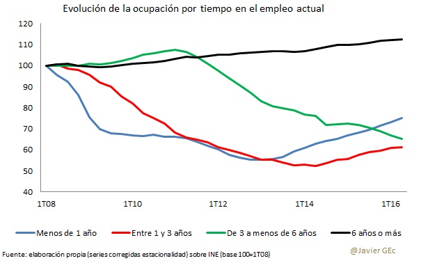 Otro elemento de interés a partir de los datos de la EPA es que se confirma una peculiaridad de nuestro mercado laboral. Por una parte, existe un importante segmento de la población que puede calificarse como casi inmune a los efectos de la crisis sobre el empleo. Se trata de los trabajadores con una mayor antigüedad –representados en el siguiente gráfico como ocupados con seis o más años en su actual empleo- y, por lo tanto, mayores costes de despido. Por el contrario, desde 2008 la rotación entre los trabajadores con menor antigüedad ha sido muy superior: en un primer momento entre los de menos de tres años, con especial impacto al principio entre los de menos de un año de experiencia. A partir de 2012, también lo ha notado el segmento con entre tres y seis años en su puesto de trabajo.