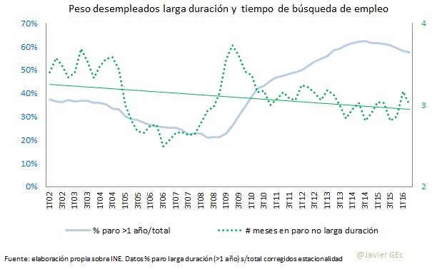Si se analiza el desempleo, también hay indicios de dualidad. En este caso podemos distinguir entre los parados de larga duración (más de un año en el paro) y el resto. Por una parte, la proporción de parados de larga duración ha crecido sensiblemente con la crisis, desde un 10% en 2008 hasta un 42% en la actualidad. En cuanto a los desempleados de menor duración, en estos momentos tienen un promedio de tres meses en situación de desempleo con cierta tendencia a la baja.