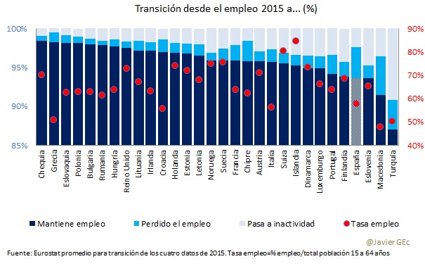 En cuanto a la ocupación, España tiene una tasa de empleo del 58%, una de las más bajas en Europa (promedio 66%). Y el porcentaje de trabajadores que perdió su empleo para pasar al paro en 2015 sólo es superado por Macedonia. Es decir, el empleo es relativamente menor y la transición del empleo al paro relativamente alta.