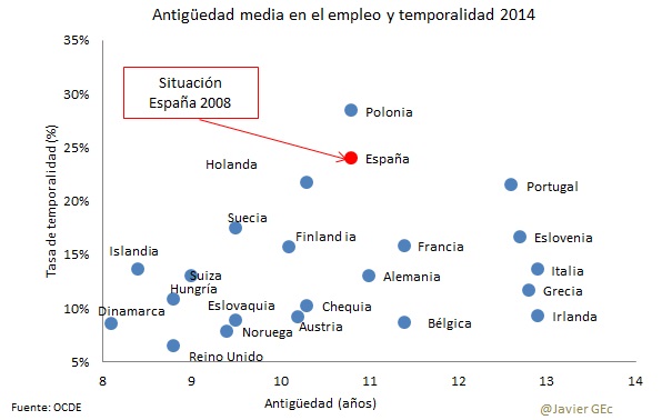 El análisis combinado de la antigüedad media y la temporalidad confirma que la mayor dualidad en el empleo en España es una realidad. El mercado laboral español tiene una tasa de temporalidad del 24%, sólo superada entre las economías de la OCDE –con un promedio del 14%- por la de Polonia. Sin embargo, la antigüedad media se sitúa en la parte medio-alta, con 11 años en el caso de España: ocupa la posición 9ª entre los 23 países de la muestra de la OCDE (el promedio entre estos 23 países es de 10 años). Esta combinación sólo es posible si, trabajadores temporales aparte, existe una importante proporción de los ocupados con una elevada antigüedad.