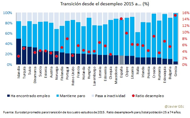 En cuanto al desempleo, tenemos una ratio de paro, medido como población desempleada sobre el total de población, de las más elevadas, con un 14% sobre población en edad de trabajar –sólo superada por Grecia. Y el dato es igualmente elevado si contamos el paro de larga duración –con un 11% sobre el total de la población, de nuevo sólo nos gana Grecia-. Sin embargo, el porcentaje de desempleados que ha encontrado empleo se sitúa en la parte media-baja. Es decir, considerando que existe un elevado porcentaje de parados de larga duración que, evidentemente, no tienen nada fácil el tránsito al empleo, el porcentaje de parados que han encontrado trabajo es relativamente elevado.